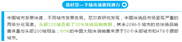 腰部力量城市也表现出两大特点:一、分布地广,但市场潜力不可小觑,贡献40%全国快消品市场销售,拥有全国37%的零售店铺;二、人口密度较小,但消费力偏高,人均快消品消费指数为22,高于头部20及尾部15。