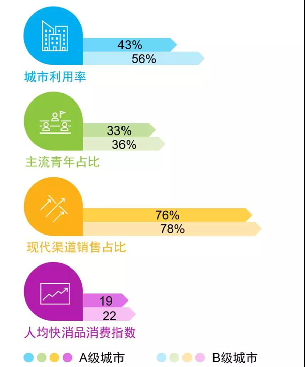 此外,表现优异的城市在现代场景、便利生活、良性均衡、活跃市场等方面,存在一定共性,但也各具特点。尼尔森报告显示,头部黄金50城中的B级城市与A级城市相比,在四个关键特征上表现更加优异:1)城市利用率上表现更佳,B级城市利用率为56%,A级城市为43%;2)36%的主流青年占比高于A级城市的33%;3)现代渠道销售占比为78%,略高于A级城市的76%;4)A级城市的人均快消品消费指数为19,B级城市则达到了22。