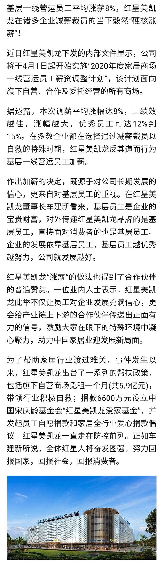逆市涨薪,红星美凯龙基层员工涨薪8%